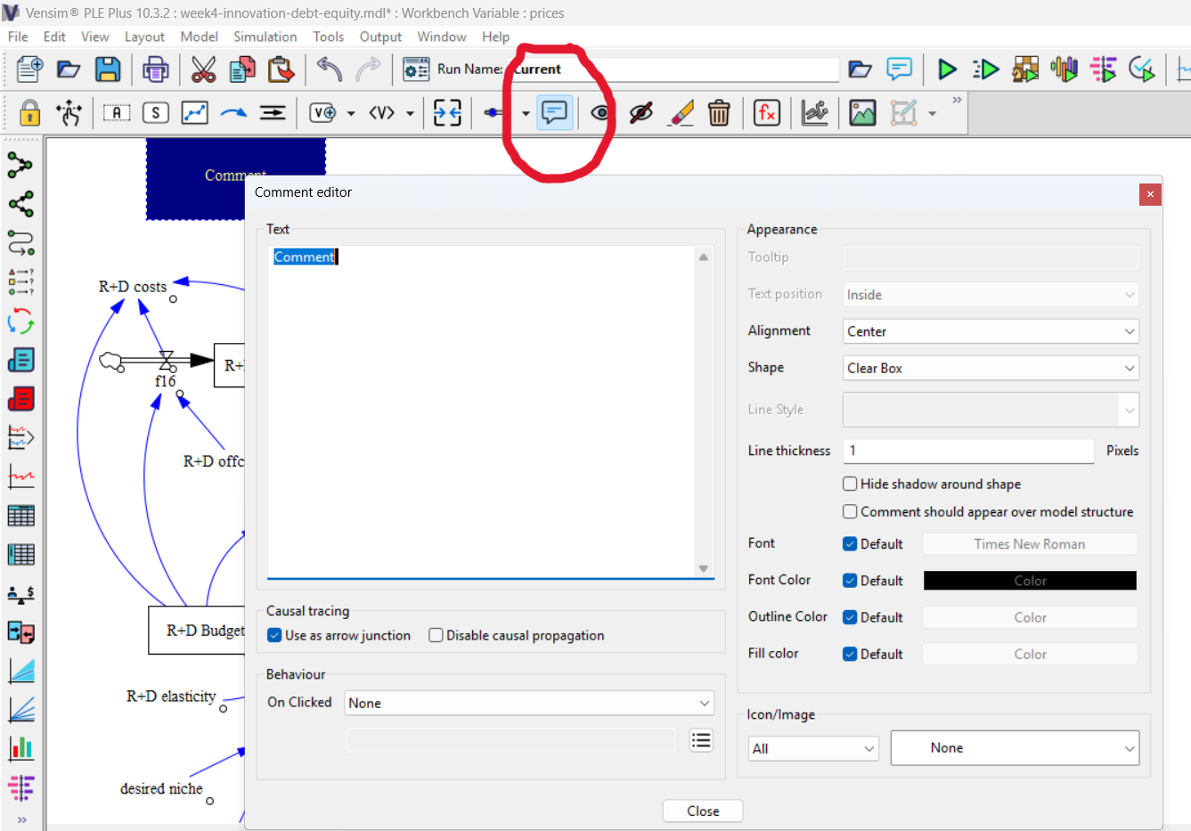 All assignments must be turned in electronically, through the learning management system, by each student. Please submit the Vensim .mdl file you have used to fulfill assignment requirements. In this model file report your interpretations of results directly using the VensimPLE comment tool. Here is a screen print of the comment tool dialogue. Note that the comment tool is highlighted in the red circle.